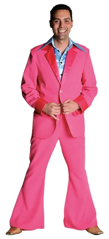 70’s – disco kostuum, jas en broek kleur pink. Dit kostuum valt behoorlijk ruim, als u twijfelt neem dan een maatje kleiner!!